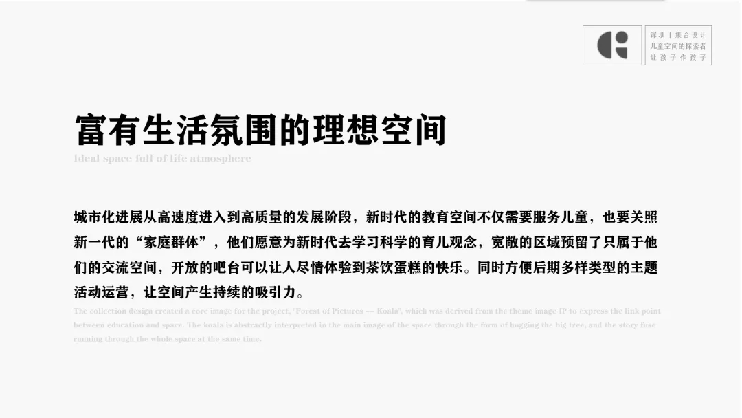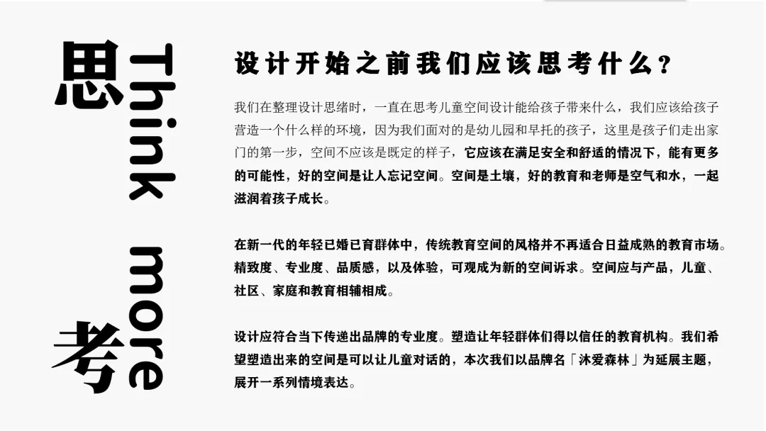 設計思考:在新一代的年輕群體中,傳統教育空間的風格并不再適合日益成熟的教育市場。精致度、專業度、品質感,以及體驗,可觀成為新的空間訴求。空間應與產品,兒童、社區、家庭和教育相輔相成。設計應符合當下傳遞出品牌的專業度。塑造讓年輕群體們得以信任的教育機構。我們希望塑造出來的空間是可以讓兒童對話的,本次我們以品牌名「沐愛森林」為延展主題,展開一系列情境表達。
