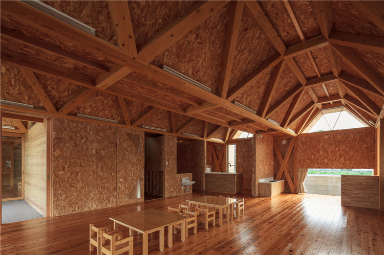 建筑的所有結構不是天花板就是墻體,木桁架梁傾斜設置,是屋頂的基礎結構木構件。這樣的設計滿足了客戶對于“保育室被木頭包圍”的要求,減少了建設成本。此外,通過降低天花板的高度,木材長度被縮短了,對空調的需求也降低了。由于天花板幾何形狀不規則且窗戶為梯形,因此雖然天花板最低的地方只有2.2m左右,但即使是成年人也不會感到壓抑。