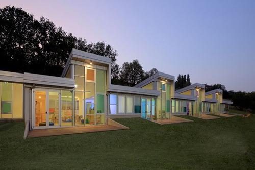 寬大的玻璃窗系統(tǒng)在一天中的不同時(shí)候都可以對(duì)太陽(yáng)光線(xiàn)進(jìn)行過(guò)濾,以保持住室內(nèi)的熱量。其它的熱源通過(guò)兩個(gè)不同的設(shè)備來(lái)獲得:放置在防水壁裝置中的地?zé)崽筋^和位于地面和熱泵間的熱交換設(shè)備。光電池辦被安裝在屋頂隔間中。雨水被收集進(jìn)特別的水槽之中,用于灌溉和沖洗浴室。顏色,材料和特別的設(shè)計(jì)形狀體現(xiàn)出了所有可持續(xù)性的系統(tǒng),它們同時(shí)也體現(xiàn)出了整個(gè)建筑的現(xiàn)代感。