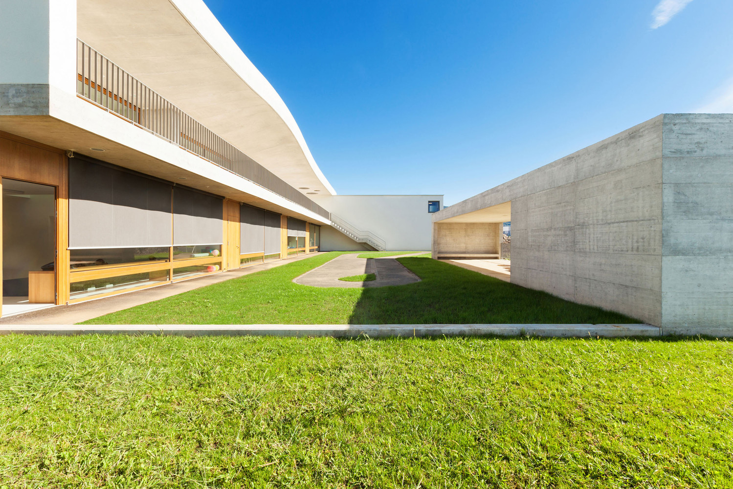 瑞士斯塔比奧在一片美麗的綠地上,佇立著斯塔比奧幼兒園,通過道路和橫墻將新樓和景觀連接起來,去為項目地塊的參考點創(chuàng)造出擁有微妙而濃重的質(zhì)感。(幼兒園室內(nèi)設(shè)計)