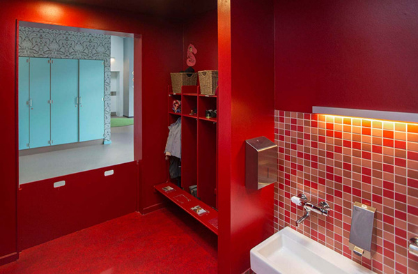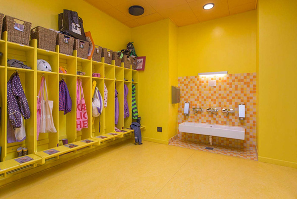 其幼兒園室內(nèi)設(shè)計(jì)“宛如一個(gè)珠寶盒”:在整個(gè)幼兒園的內(nèi)部都是繽紛的色彩、復(fù)雜的圖案和不同的肌理愉悅了孩子們的身心。同時(shí)裝飾有色彩、圖案豐富的壁紙和瓷磚。建筑如同一個(gè)大型的珠寶盒,這能夠喚醒孩子的好奇心,培養(yǎng)孩子們的探索精神,而且還為孩子們創(chuàng)造出五彩的內(nèi)部空間和趣味十足的游樂場供孩子們玩耍嬉戲,有趣的活動(dòng)空間設(shè)計(jì)讓孩子們的由著足夠是運(yùn)動(dòng)量。雖然平面布置十分復(fù)雜好似迷宮,但不同的色彩便于人們辨別方向。