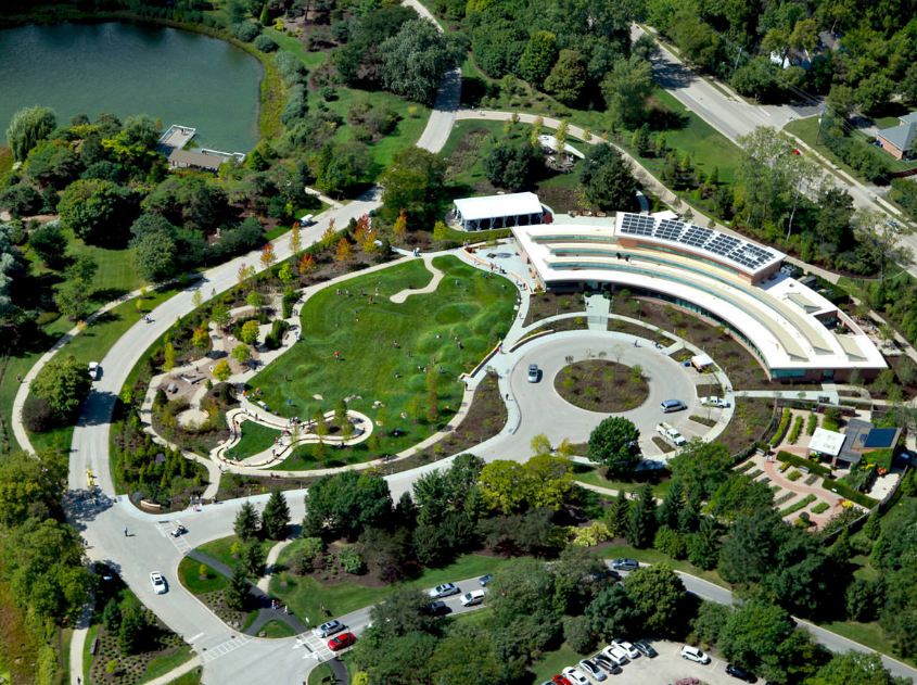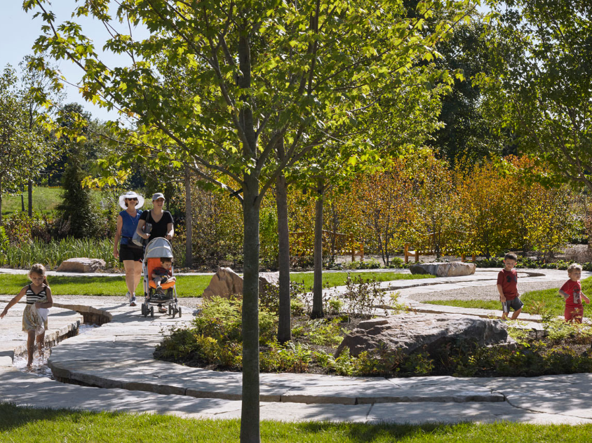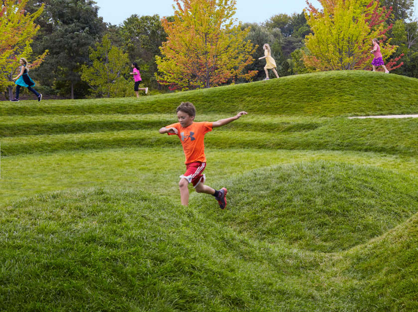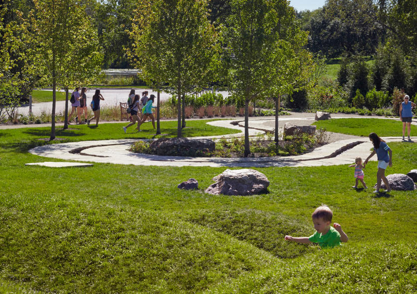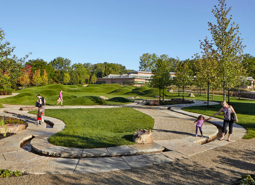 雷根斯坦學(xué)習(xí)園區(qū)是芝加哥植物園新設(shè)的環(huán)境探索中心和自然游樂(lè)場(chǎng)。這個(gè)占地六英畝的園藝園區(qū)作為科學(xué)園藝中心,為充滿活力的家庭社區(qū)服務(wù),提供與自然環(huán)境的互動(dòng)體驗(yàn),每年游客量超過(guò)12.5萬(wàn)人。該設(shè)計(jì)促使家庭和各年齡段兒童參與豐富的戶外體驗(yàn),例如以探索為導(dǎo)向的學(xué)習(xí)和游戲,從而更深入了解生態(tài)系統(tǒng)。廣闊的花園提供各種自然體驗(yàn)和探索活動(dòng),游客穿梭在草地、戲水小路、石塊、多樣的林地種植和柳枝隧道中。這個(gè)再生工程被設(shè)想為通向自然世界的門戶,一年四季提供探索與創(chuàng)造的機(jī)會(huì)。